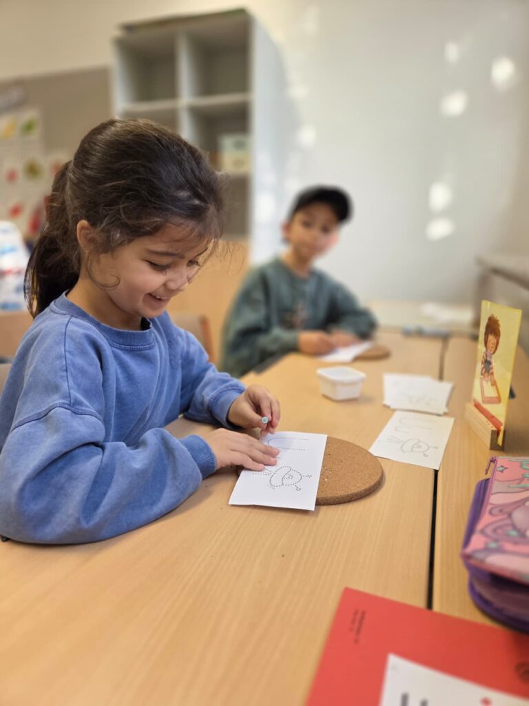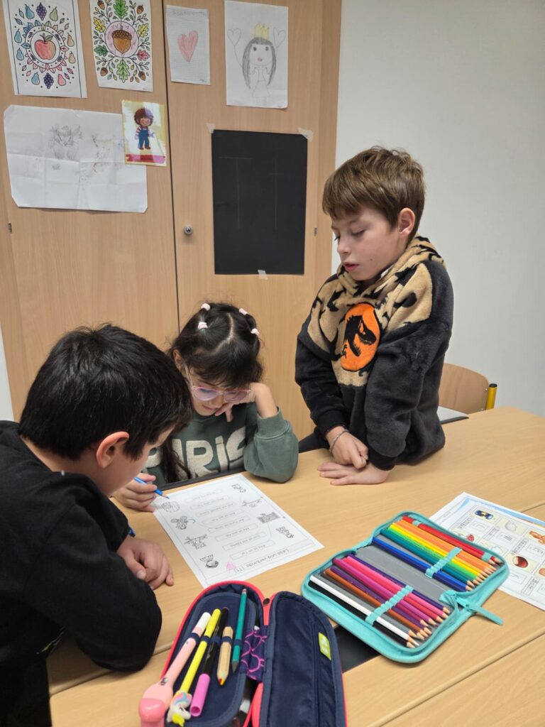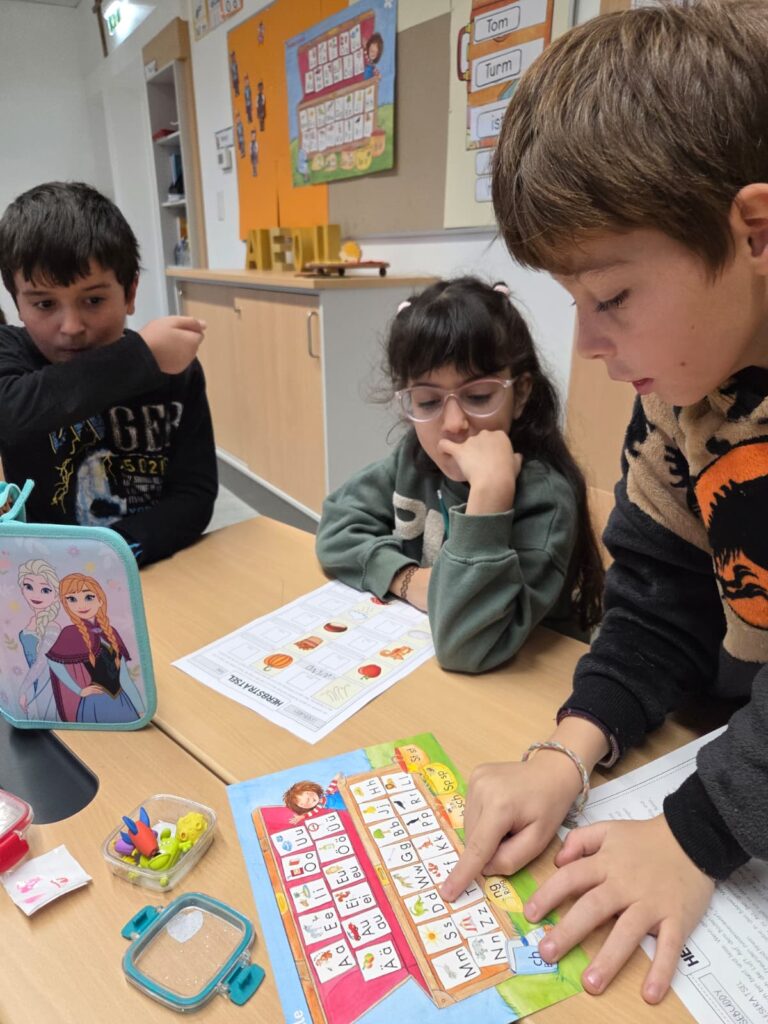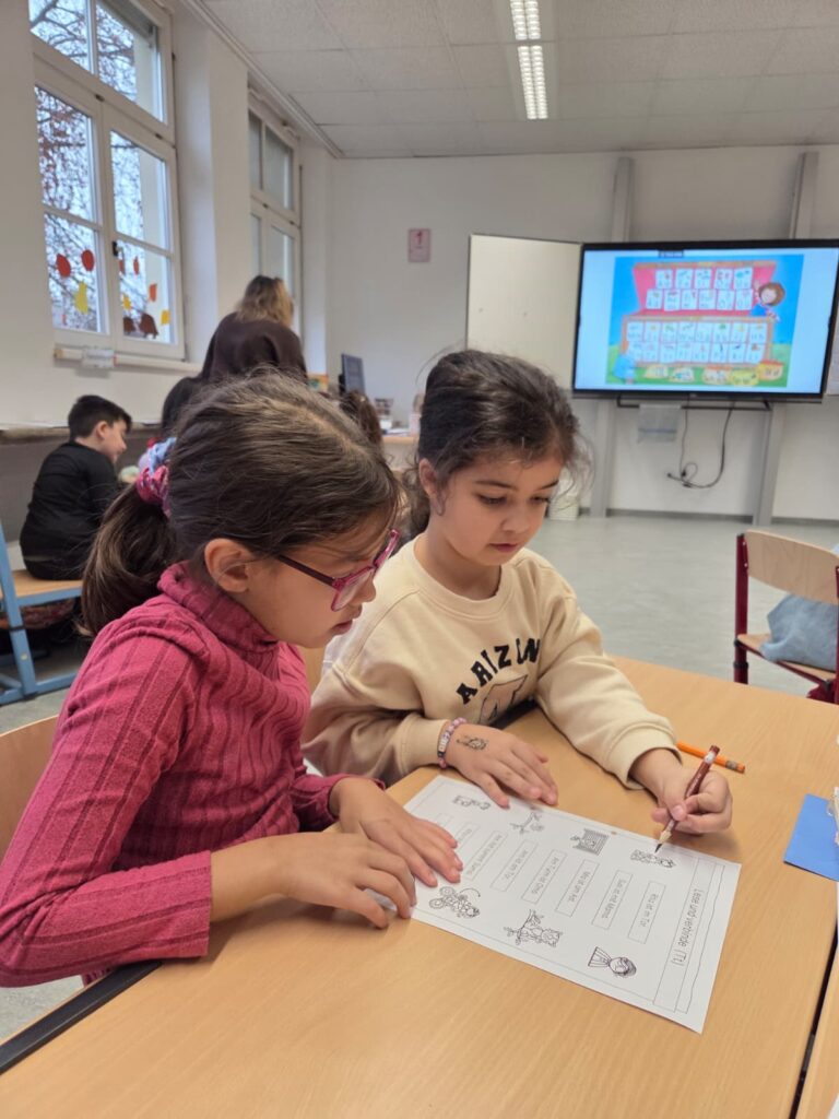 Beim ersten Treffen durften die Kinder der 3. Klasse herbstliche Rätsel vorlesen. Die Schülerinnen und Schüler der DFKL suchten anschließend das passende Bild dazu aus und schrieben – mithilfe der Lauttabelle – den richtigen Anlaut auf. Danach wechselten die Rollen: Die Kinder der DFKL zeigten stolz, was sie bereits lesen können, und lasen einfache Sätze vor. Die Kinder der 3B begleiteten sie dabei geduldig und motivierend.