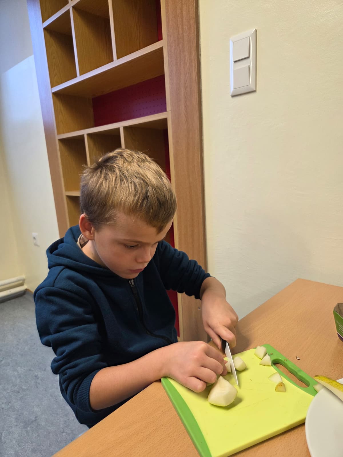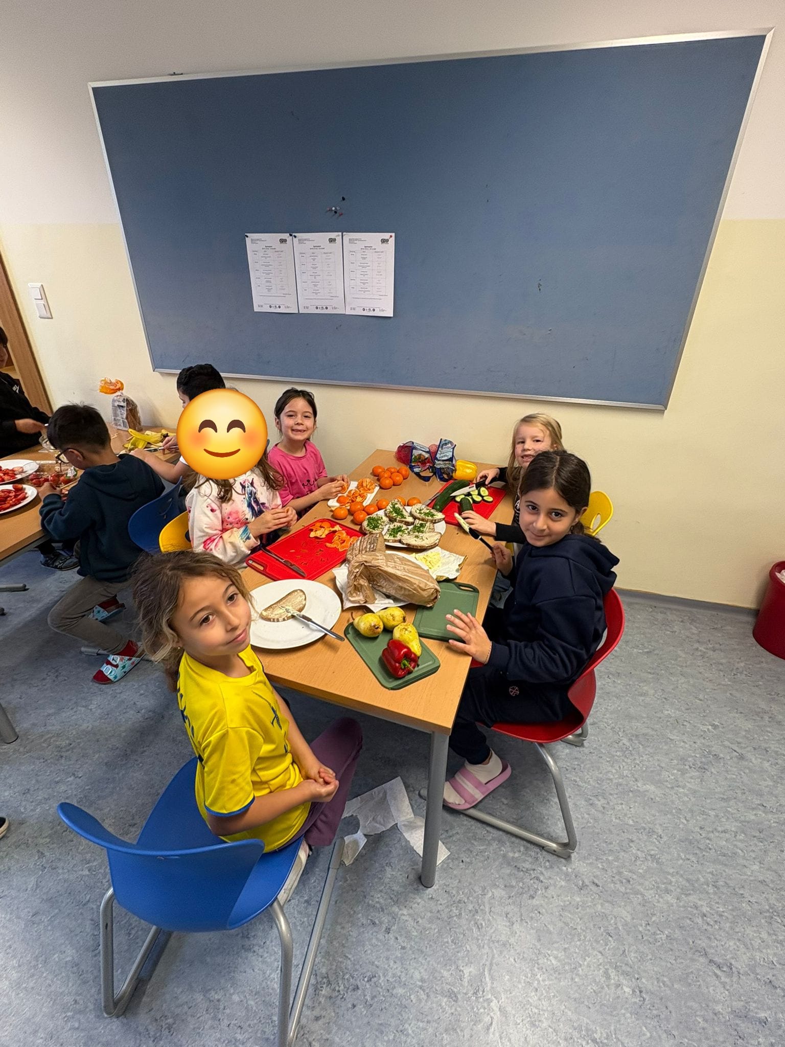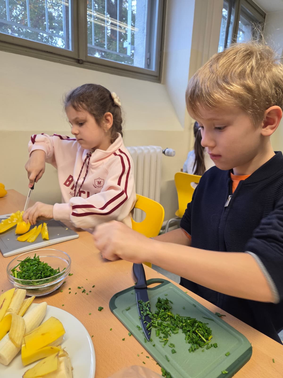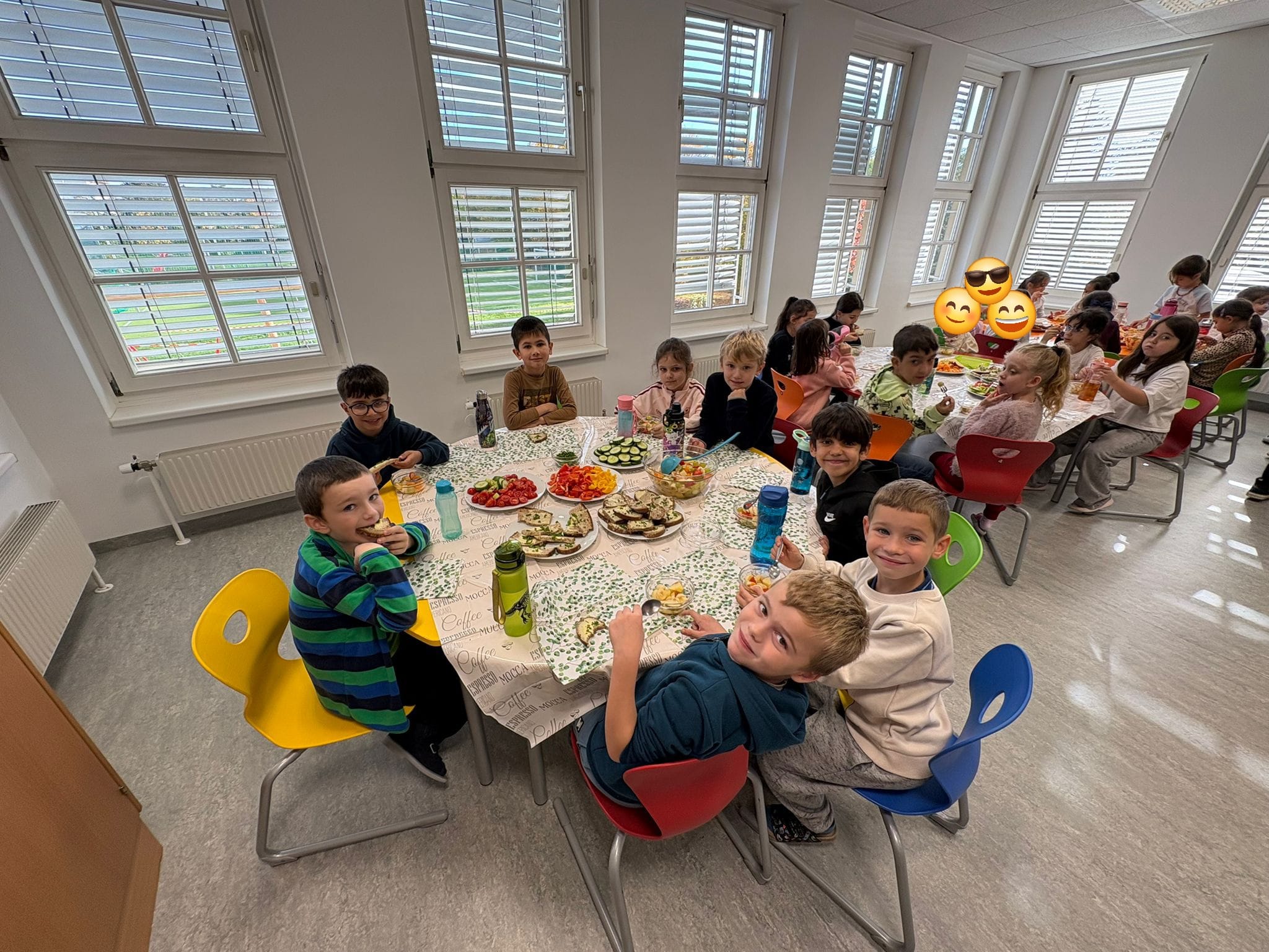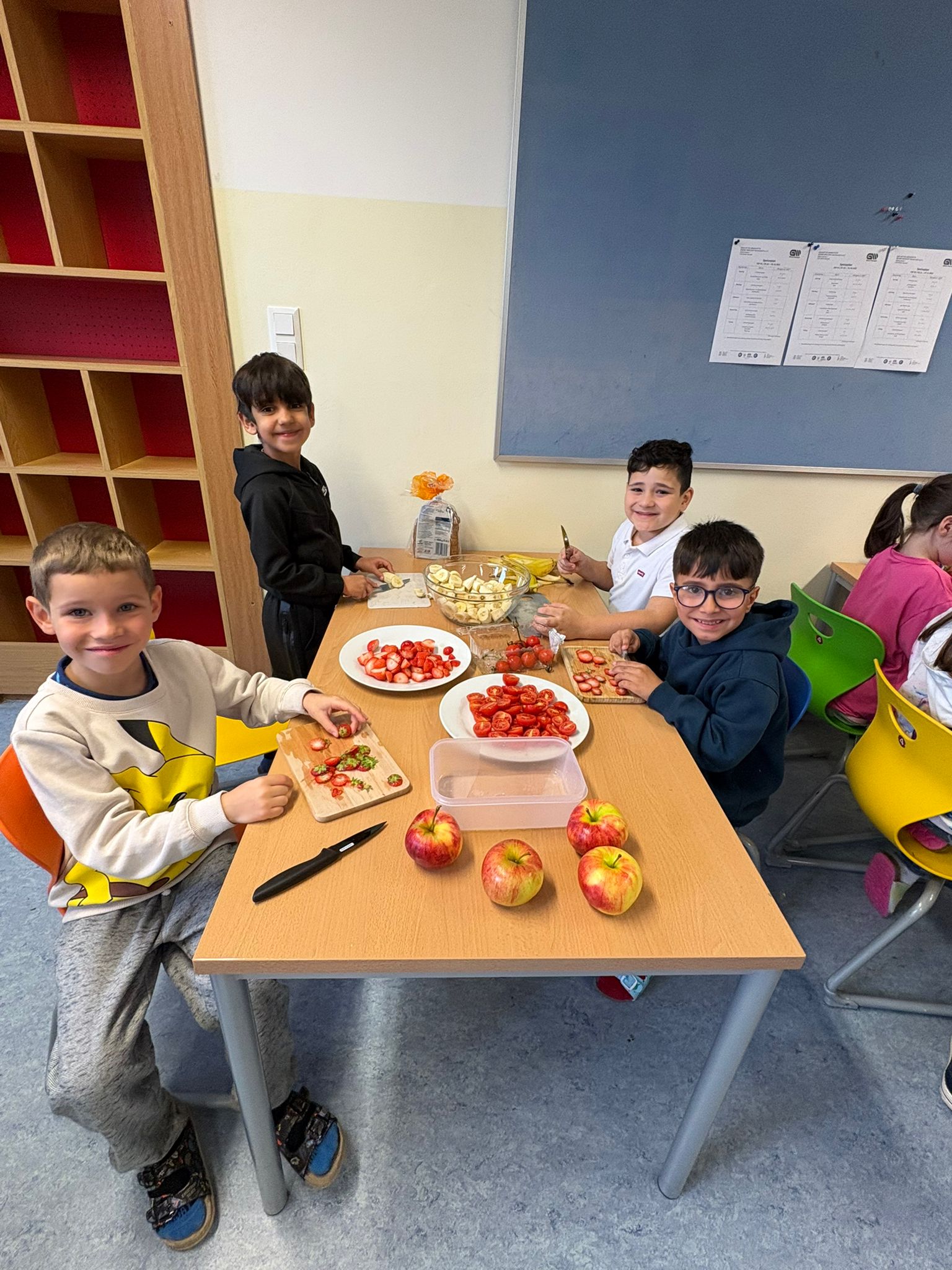 Im Rahmen des Sachunterrichts beschäftigten sich die Kinder der 1a und 1b Klasse mit dem Thema „Obst und Gemüse. Zum Abschluss des Themas gestalteten die Schülerinnen und Schüler ihre eigene gesunde Jause. Gemeinsam wurde frisches Obst und Gemüse geschnitten, Butterbrote geschmiert und mit Schnittlauch bestreut und ein bunter Obstsalat zubereitet.