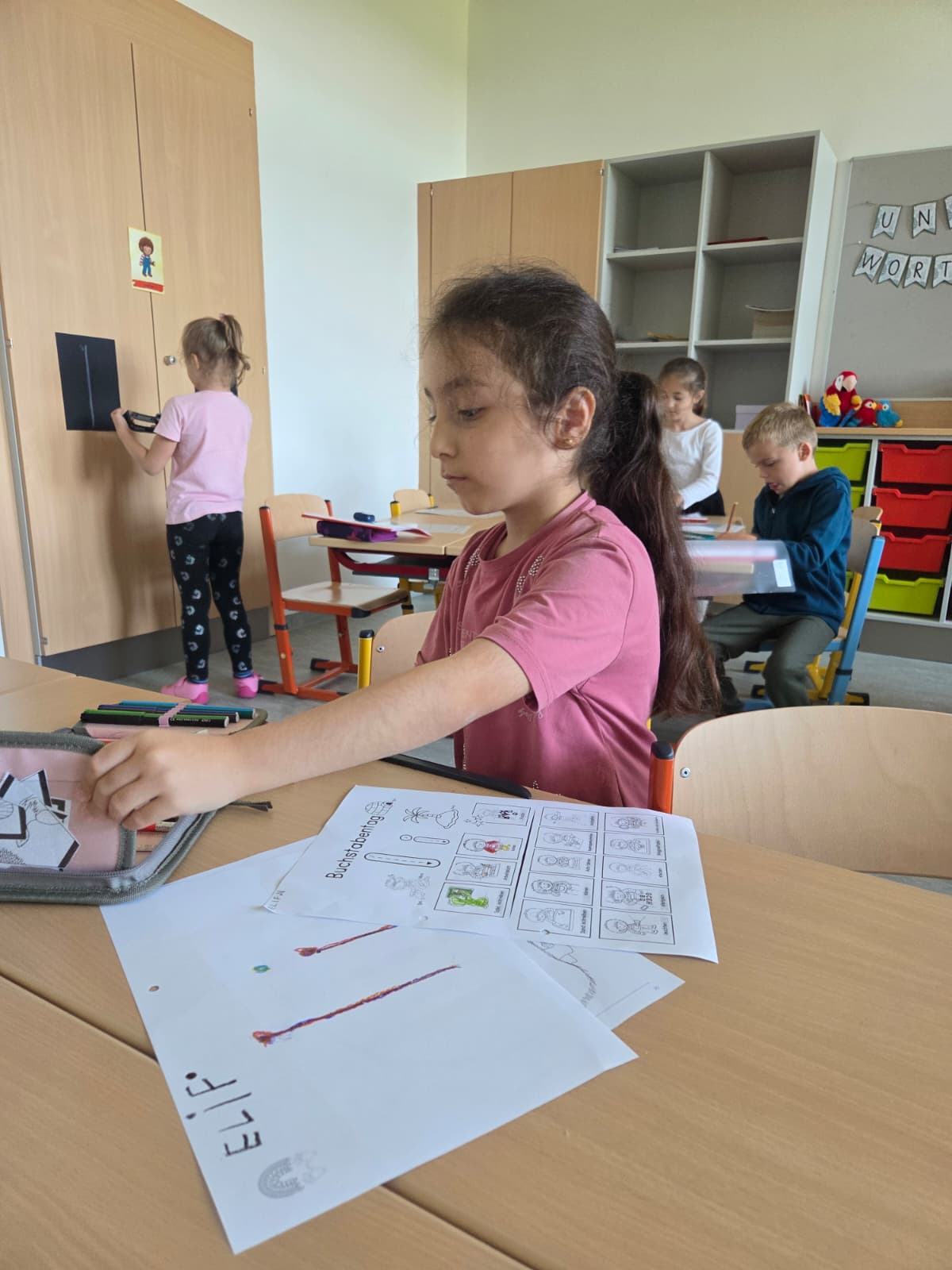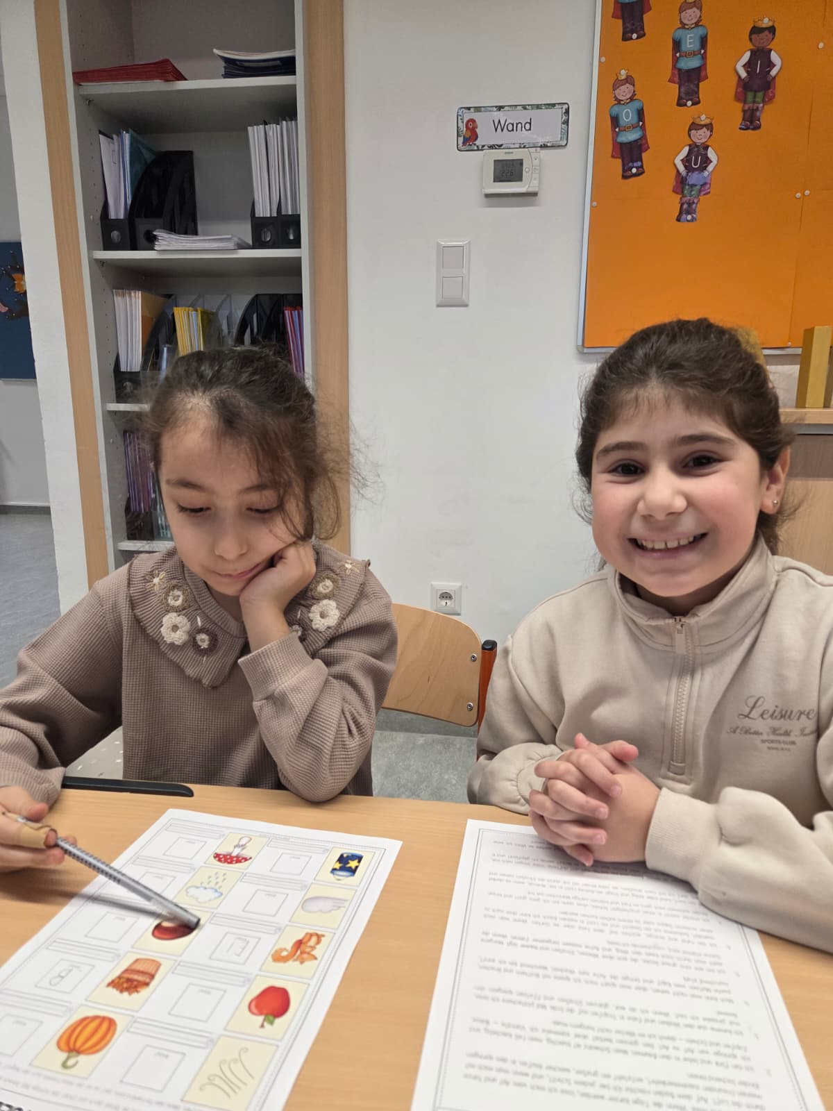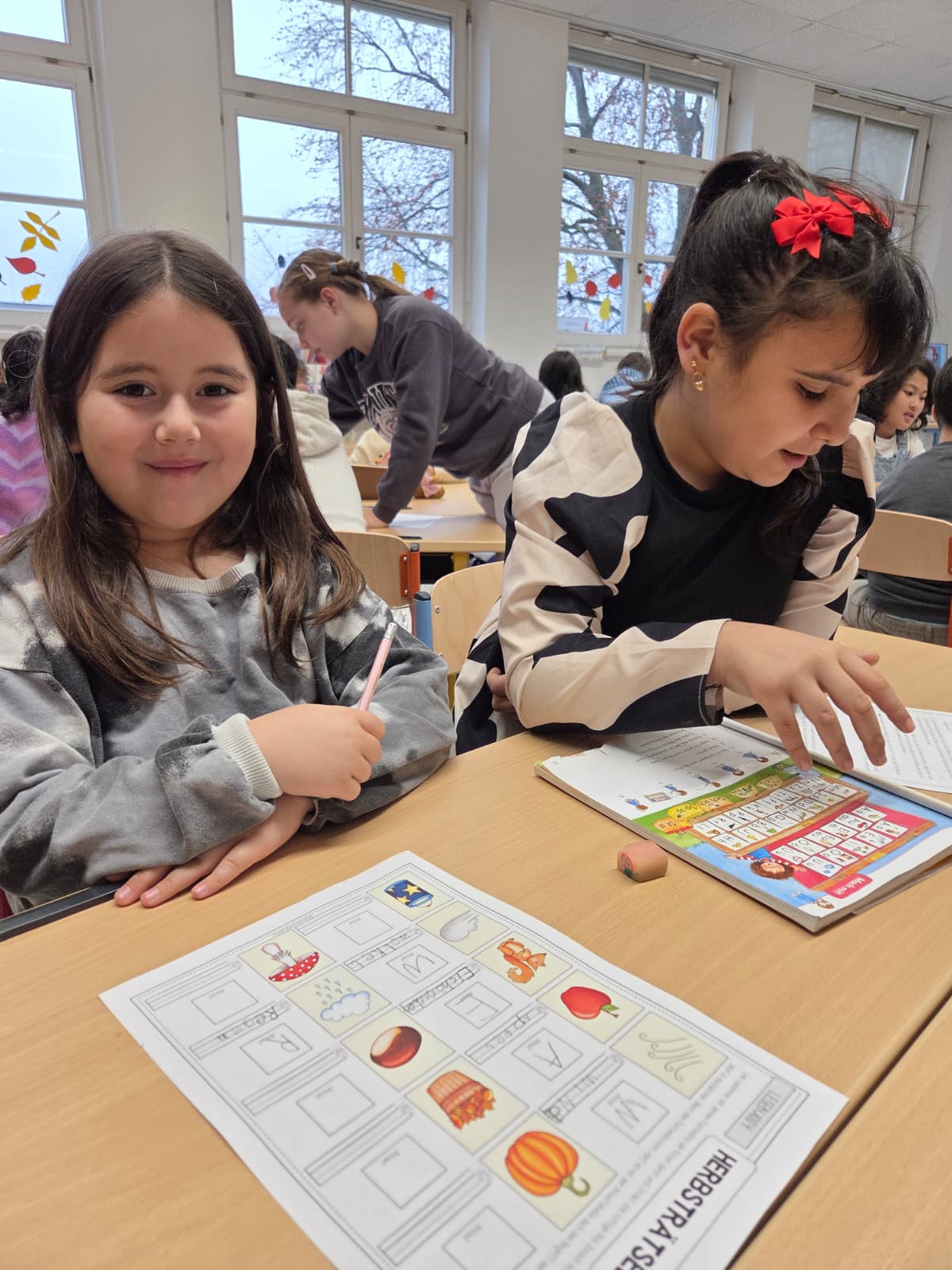 Beim ersten Treffen durften die Kinder der 3. Klasse herbstliche Rätsel vorlesen. Die Schülerinnen und Schüler der DFKL suchten anschließend das passende Bild dazu aus und schrieben – mithilfe der Lauttabelle – den richtigen Anlaut auf. Danach wechselten die Rollen: Die Kinder der DFKL zeigten stolz, was sie bereits lesen können, und lasen einfache Sätze vor. Die Kinder der 3B begleiteten sie dabei geduldig und motivierend.