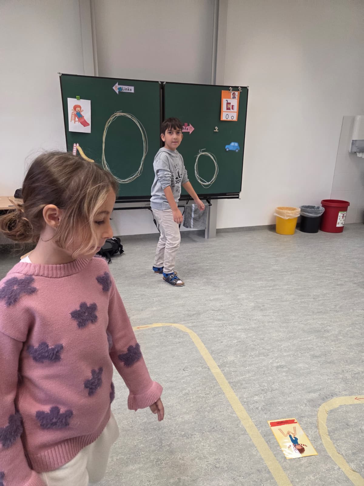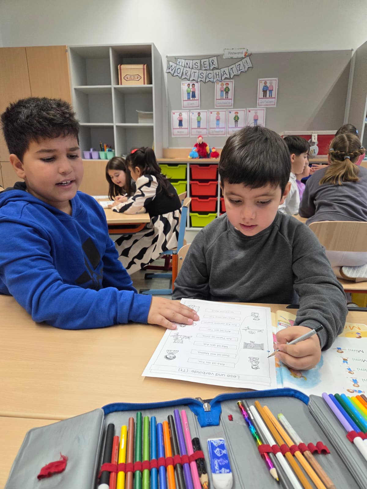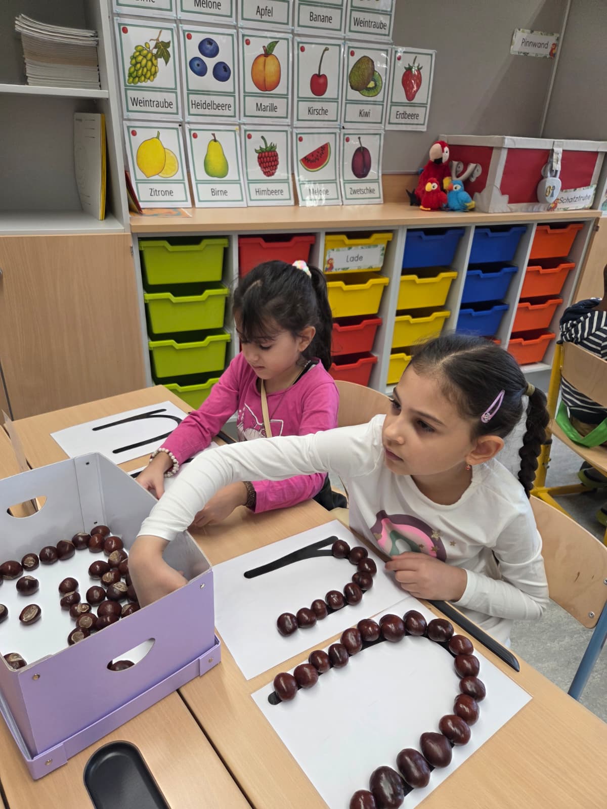 Beim ersten Treffen durften die Kinder der 3. Klasse herbstliche Rätsel vorlesen. Die Schülerinnen und Schüler der DFKL suchten anschließend das passende Bild dazu aus und schrieben – mithilfe der Lauttabelle – den richtigen Anlaut auf. Danach wechselten die Rollen: Die Kinder der DFKL zeigten stolz, was sie bereits lesen können, und lasen einfache Sätze vor. Die Kinder der 3B begleiteten sie dabei geduldig und motivierend.