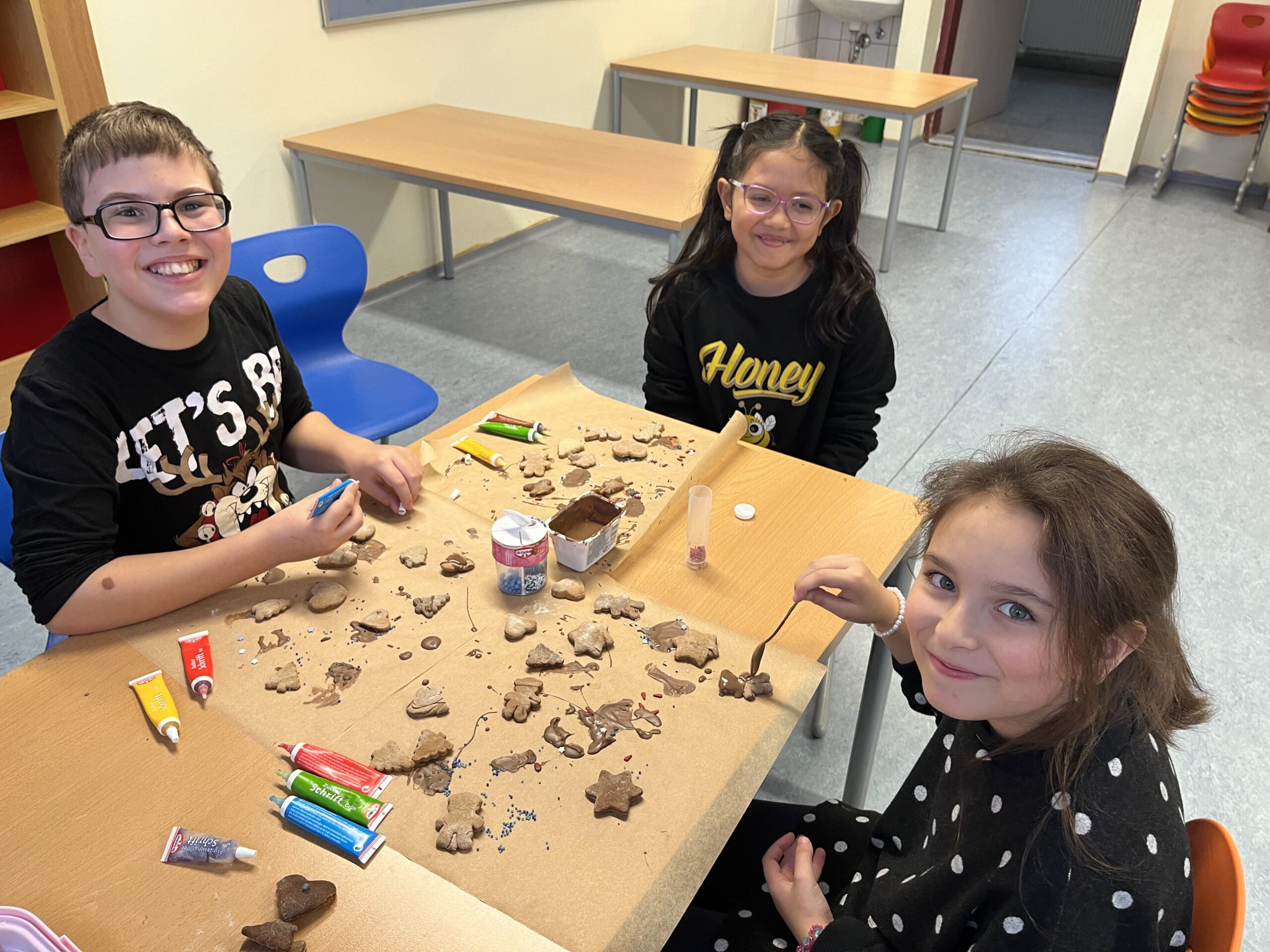Kurz vor Weihnachten fand in der 4b eine Weihnachtswerkstatt mit vielen tollen Stationen statt. Die Kinder erwürfelten sich lustige Sätze, lösten weihnachtliche Rätsel und spielten viele winterliche Spiele wie Domino, Memory und Würfelspiele. Natürlich wurde auch fleißig Lebkuchen für die Weihnachtsfeier gebacken und verziert.